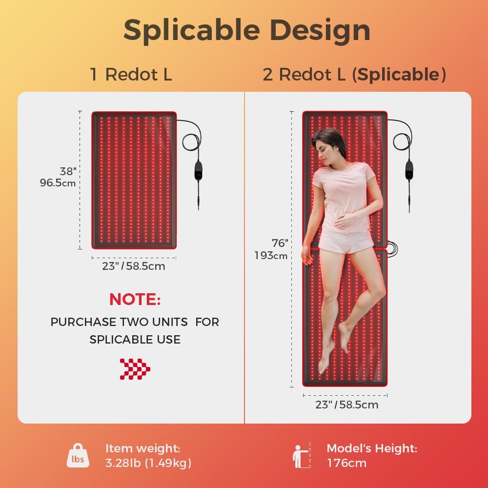 - Hands-Free Design & Comfortable: Splice design allows you to create your own wellness bed (second unit sold separately). You can use the therapy bed while you’re sleeping since the temperature is between 104°F and 122°F (40°C and 50°C) from Power P1 to P5, which means you don’t have to worry about overheating your skin. Our red and near infrared therapy brings the powerful effect for both superficial & topical as well as deep tissue.