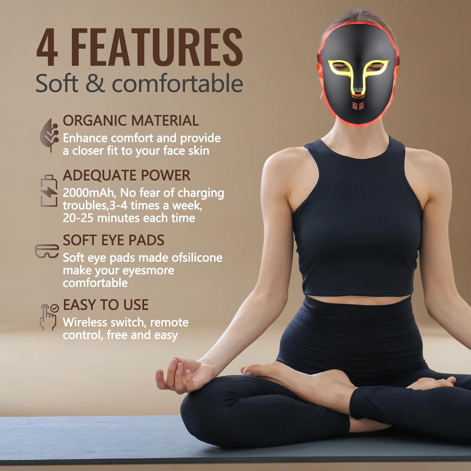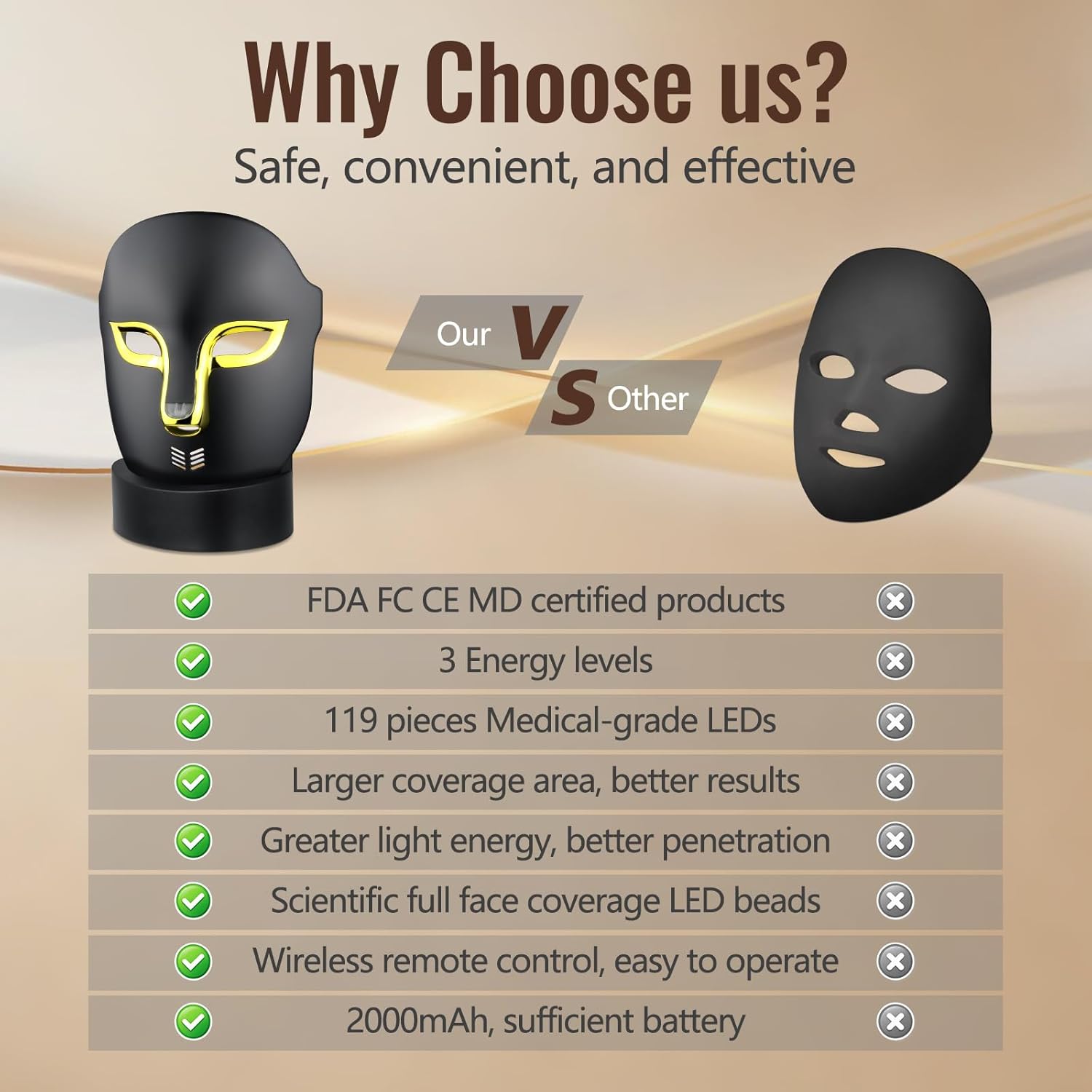 - Ergonomic Design for Safe, Universal Use: Engineered with a comfortable, close-fitting shape to maximize light absorption and treatment effectiveness. Safe for all skin types with no reported side effects, delivering efficient results.The LED light therapy face mask supports wireless use and comes with a Type-C charging cable for convenient recharging. With 119 LED bulbs and 4 light therapy modes