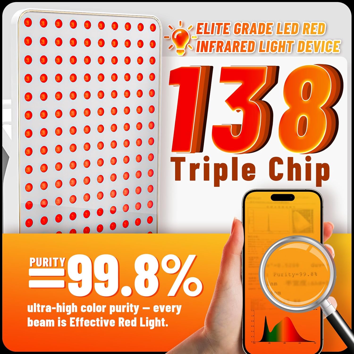 • Triple-Chip LED Beads & Optical Design:Dual-Use Red Light Therapy Panel for Face & Body features 138 high-energy triple-chip LED beads working in synergy, delivering a total radiant power of 15.2W. Each bead features a precise 60° beam angle optical design, ensuring uniform light coverage over targeted areas for maximum treatment efficacy.