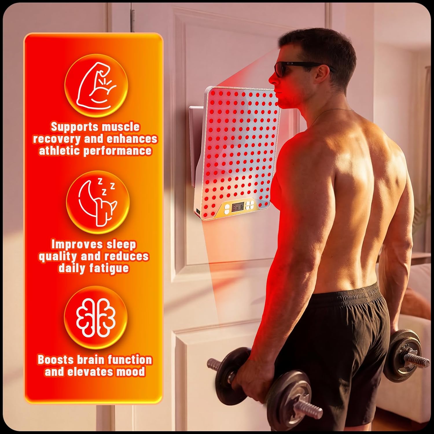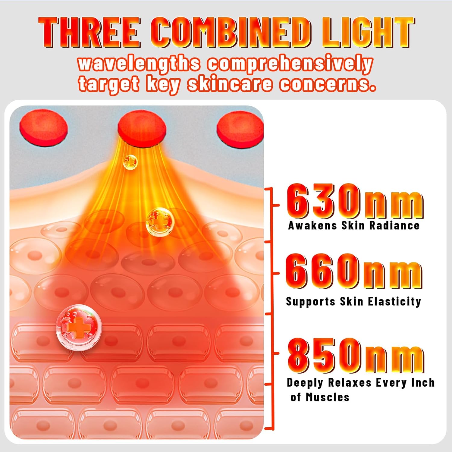 • Scientifically Validated Wavelengths:Red Light Therapy Panel incorporates 630nm, 660nm, and 850nm wavelengths targeting epidermal layer, local tissues, and deep muscles for significant effects. This wavelength combination excels in improving skin complexion, promoting blood circulation, relaxing deep muscles, optimizing sleep quality, and more.